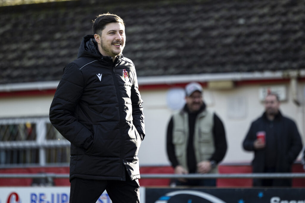 BRITON FERRY, WALES – 29TH DECEMBER 2024: Briton Ferry manager Rhys James ahead of kick off. Briton Ferry Llansawel v Cardiff City in the Genero Adran Premier at Old Road on the 29th December 2024. (Pic by Lewis Mitchell/FAW)