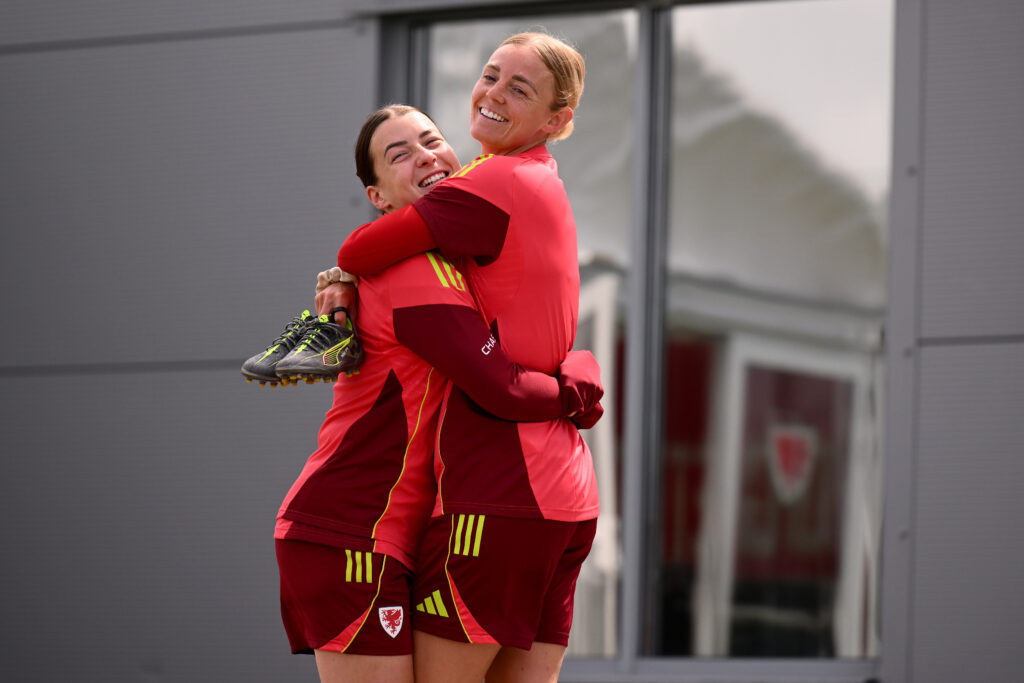 CARDIFF, WALES – 01 JUNE 2025: Wales’ Angharad James and Wales’ Sophie Ingle during a training session at the Vale Resort on the 1st of June 2025. (Pic by Ashley Crowden/FAW)