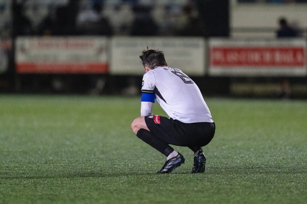BALA, WALES - 27 FEBRUARY 2026:Harry Dean of Bala Town dissapointed with the result during the JD Cymru Premier 2025/26 - Play-Off Conference fixture Bala Town vs Llanelli Town at Maes Tegid, Bala, Wales (Pic by Jamie Edwards)